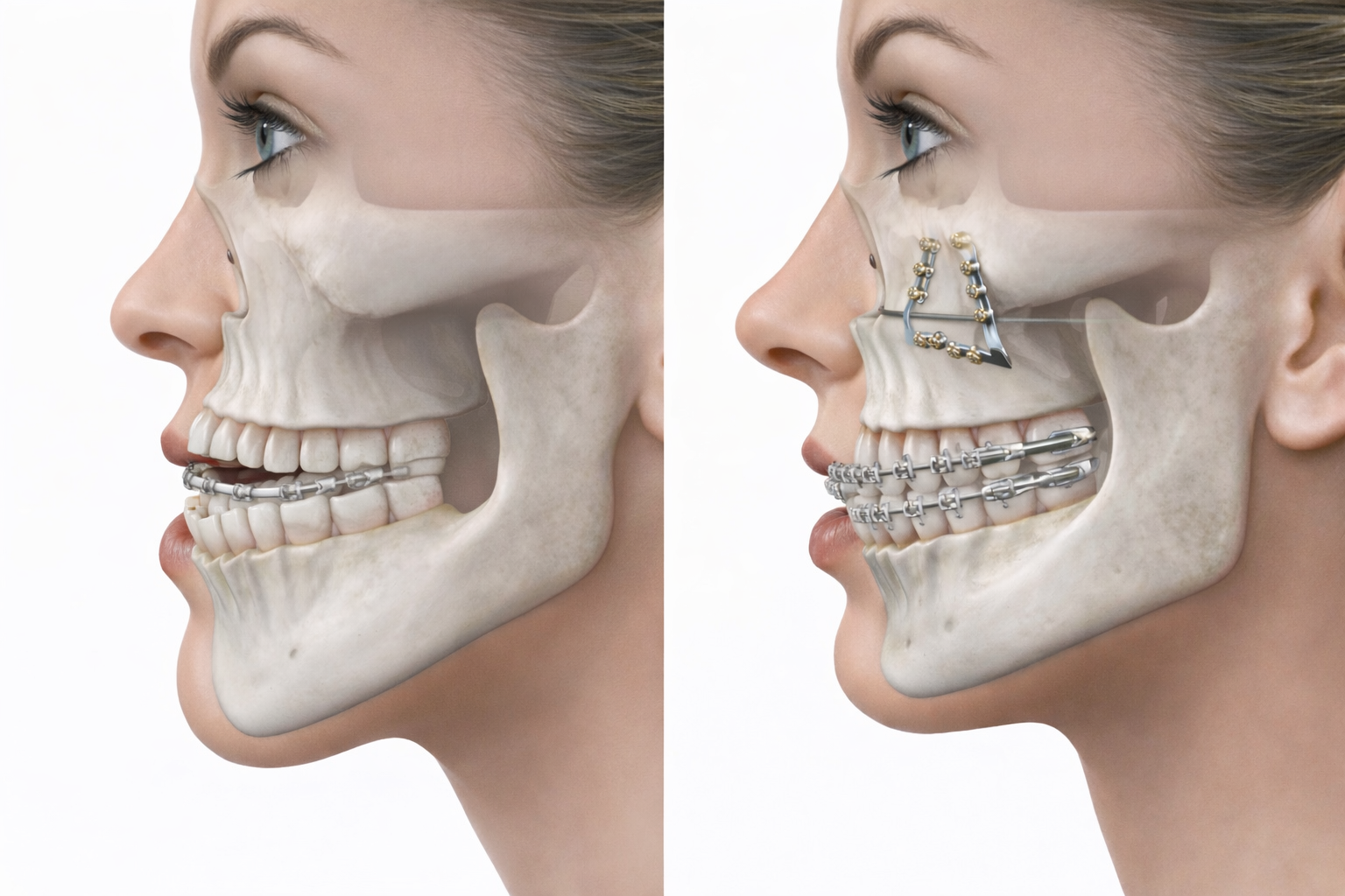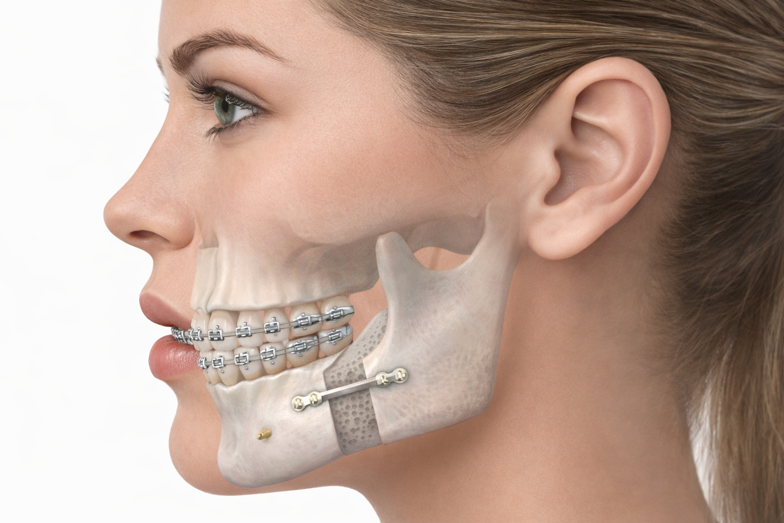 Orthodontic preparation for jaw surgery to correct complex bite and jaw alignment issues.